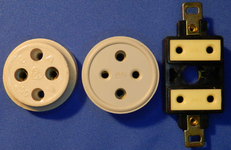 Figura 13 – Antigas tomadas de 2 pinos redondos, a da esquerda é de porcelana (louça) e as restantes são de baquelite.