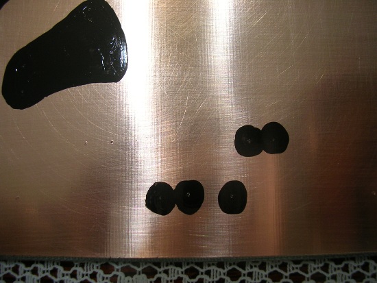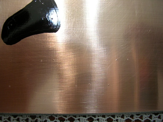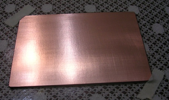 Após a limpeza, não se deve tocar na face cobreada, pois a gordura dos dedos dificulta a corrosão. Fixá-la pelas bordas, sobre a superfície de trabalho. A placa ficará com a aparência da figura 5.