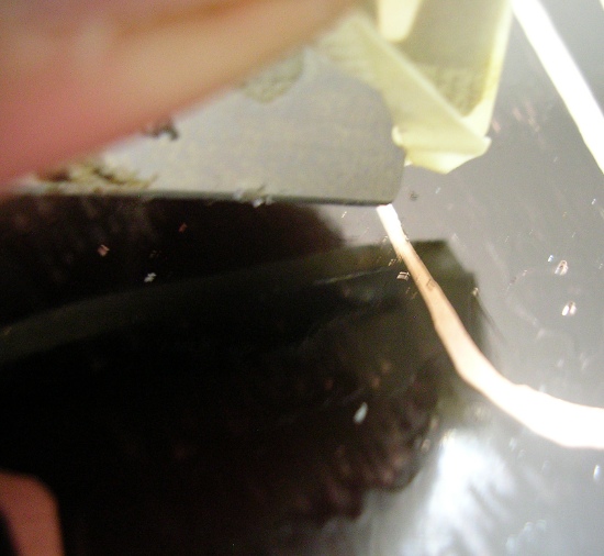 Eventualmente, poderão ocorrer erros nesta fase. Para corrigi-los, utiliza-se uma lâmina de barbear antiga, como na figura 4. Com uma pequena extremidade exposta (para não cortar os dedos), consegue-se raspar o que foi desenhado incorretamente a caneta.