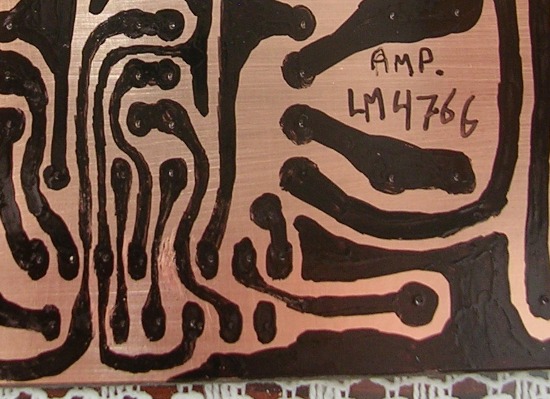 As fotos que servem de exemplo referem-se a dois diferentes projetos, já que o intuito é demonstrar a técnica. Um deles é um atenuador para amplificador de guitarras valvulado (L-pad), que foi feito em placa de fibra de vidro e poderá virar post em breve. O outro é um amplificador com o integrado LM4766, da National. O projeto do amplificador está disponível na internet – ver referência [1] – e tem um desenho muito cuidadoso. Inclusive, funcionou perfeitamente, tem ótima qualidade.
