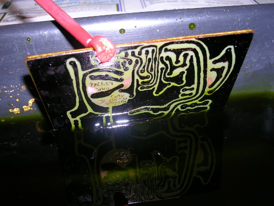 Utiliza-se a haste plástica para movimentar a placa em vaivém, até o ponto em que não apareçam mais manchas de cobre nas áreas não cobertas pela tinta. Nas figuras 24 até 29 podem ser vistos os passos.