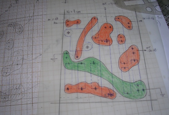 Para facilitar a visualização da placa, costumo hachurar as trilhas a lápis, conforme elas forem ficando prontas (figura 2). Isto diminui a possibilidade de confusão entre o que é trilha e o que é placa. Após ter uma ideia mais ou menos definida de como ficará o projeto, o desenho é passado para uma folha de poliéster.