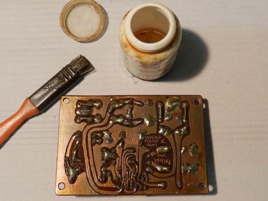 Nesta imagem pode-se notar um pincel comum de 1/2″, com as cerdas cortadas bem curtas. Com ele, pode-se aplicar força sobre a placa, forçando a dissolução da resina da solda. Ele é de uso exclusivo para aplicação de verniz. Ao secarem as cerdas, elas ficam duras, mas é só pressionar firmemente contra a mesa que o verniz se quebra e o pincel pode ser reutilizado.