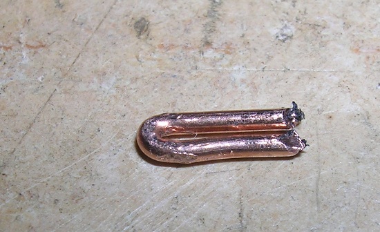 Daí, foi dobrado um pedaço de fio rígido em forma de U (figura 4). Este fio é de aço cobreado, aquele encontrado em instalações telefônicas externas, conforme já comentado em post anterior.