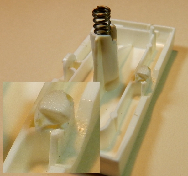 Para a remontagem, o contato móvel é posicionado como na fig. 5. A mola da tecla vai encaixada na pequena saliência central, como se vê na fig. 6. Com cuidado para não desalinhar o contato móvel, aplica-se uma pressão na tecla, de modo que os dois lados encaixem ao mesmo tempo (figuras 6 e 7). E está pronto.