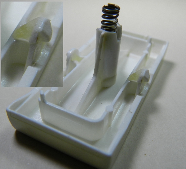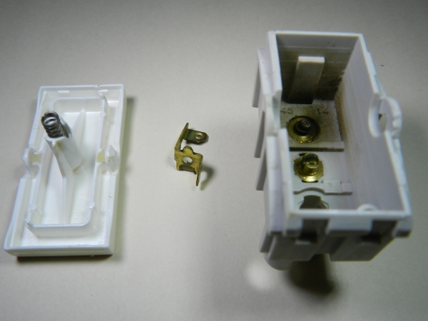 Desta vez, a manutenção é para uma tecla de um interruptor de embutir, que quebrou no encaixe da gangorra (figura 1 e no detalhe). O problema aconteceu por causa do costume de um dos moradores sempre ligar ou desligar a luz na base do tapa ou até soco.