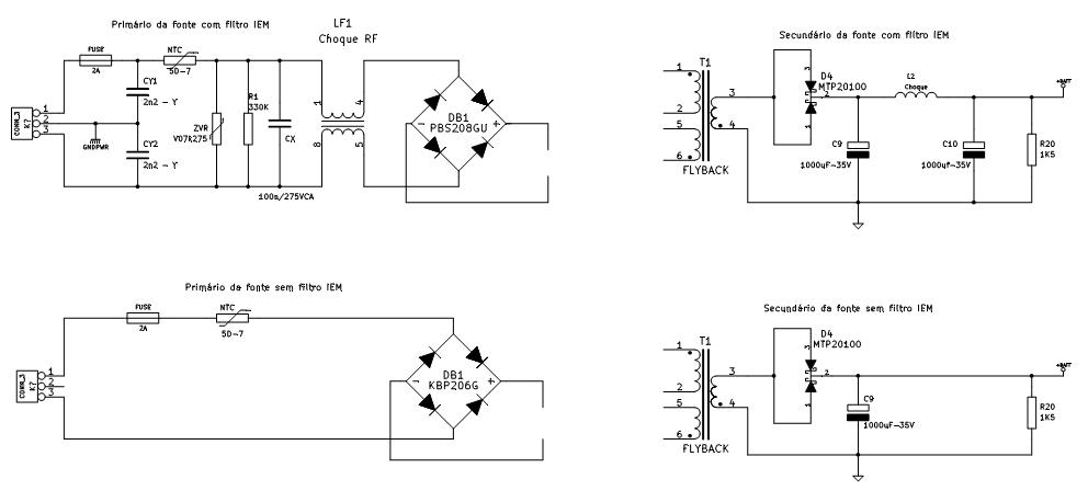 Na figura 11, divididos em 4 desenhos, são mostrados os componentes de filtragem contra IEM. Nos 2 desenhos de cima, estão os circuitos idealizados, que poderiam estar implementados na placa. Abaixo, os outros 2 desenhos indicam o que o fabricante montou. O circuito de filtragem do primário está no lado esquerdo e na direita, os componentes do estágio secundário (saída de alimentação).