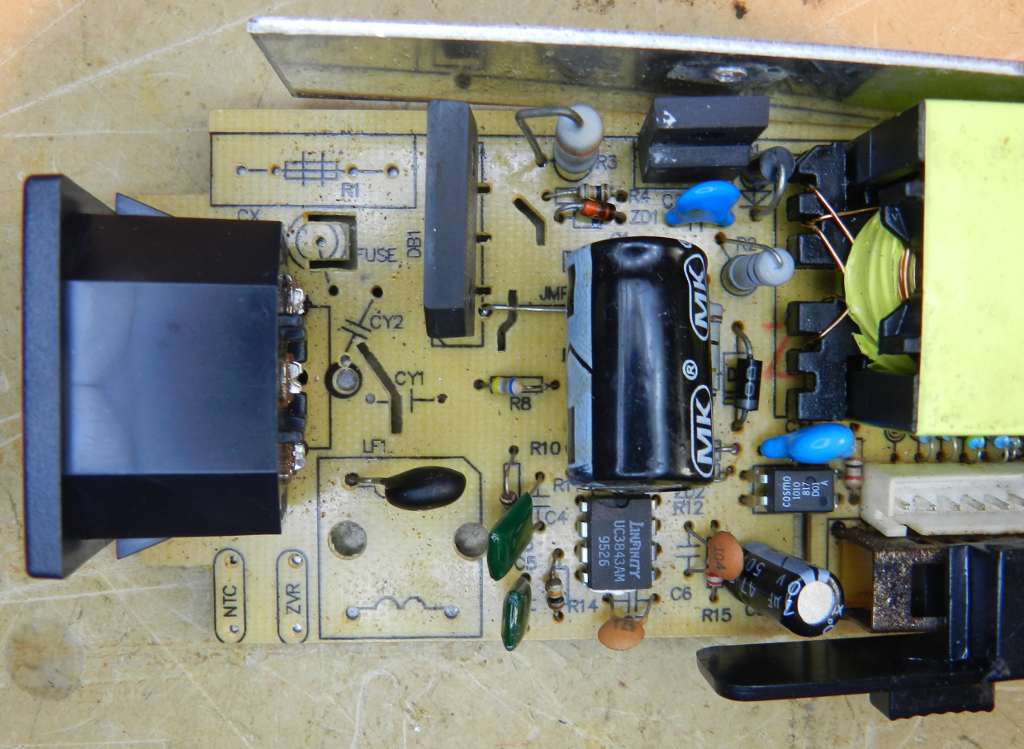 Após a troca da ponte retificadora, a fonte continuou inoperante. Isto nos obrigou a aprofundar a análise, de modo a compreender a extensão do defeito. O equipamento emprega a topologia flyback, com o circuito integrado UC3843, que controla o regime de chaveamento de Q1.