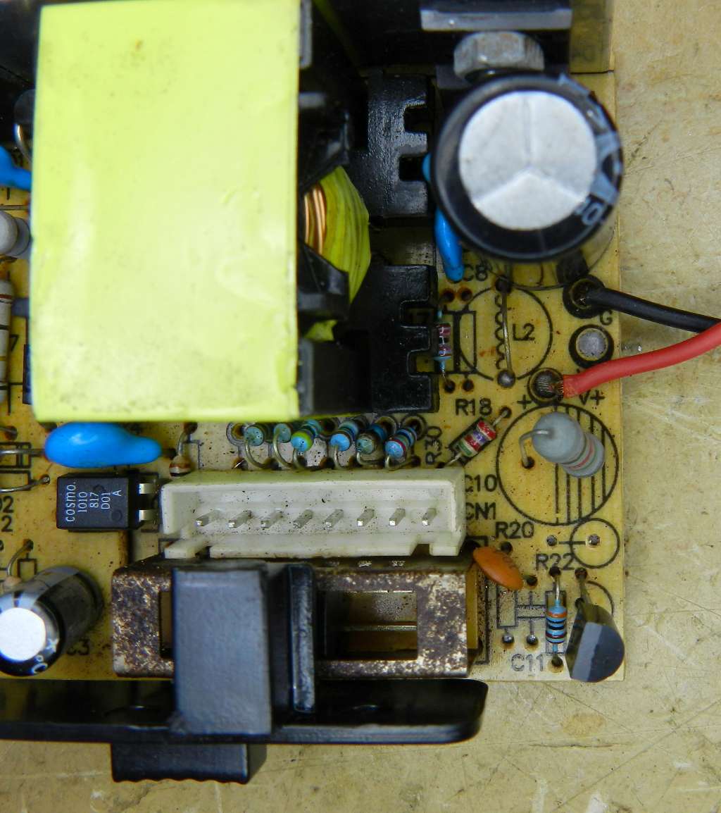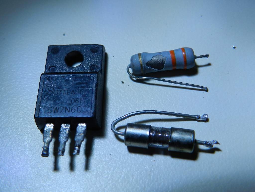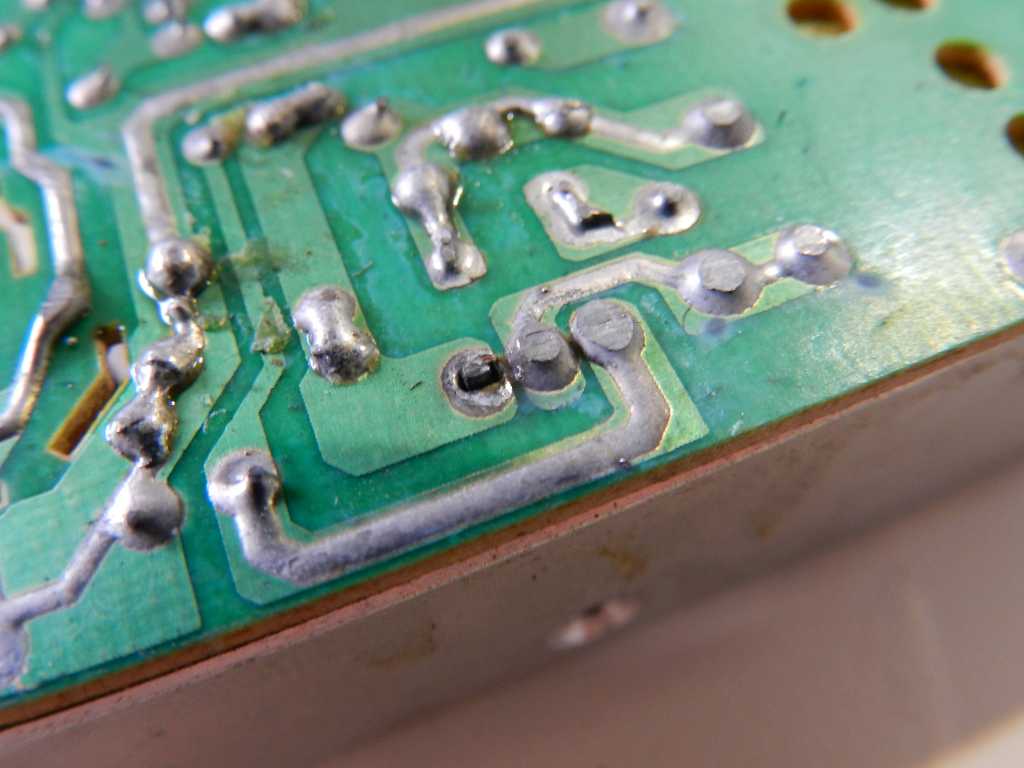 Esta fonte tinha queimado vários componentes, provavelmente por causa duma falha na solda do transistor MOSFET de chaveamento. Como se vê, a solda foi esmerilhada (figura 2) para reduzir sua altura e poder caber no invólucro. Isto pode ter piorado a qualidade da união, pois aparecem trincas entre os terminais do transistor e as outras gotas de solda.