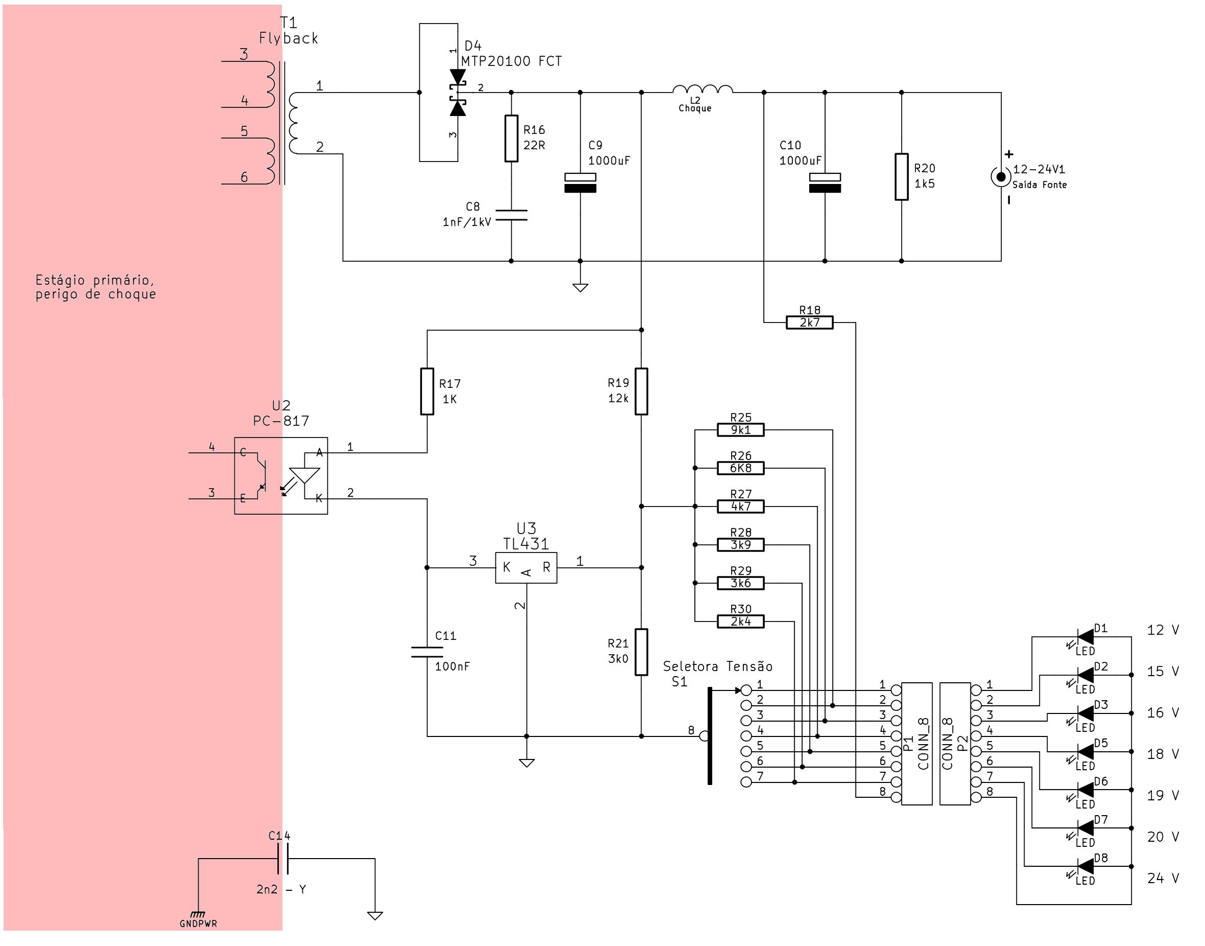 Mais adiante, será abordado o estágio secundário, que é o setor de saída, de 12 a 24V. A fonte foi separada em estágio primário e secundário porque, apesar de haver dependência entre eles, as etapas podem ser entendidas mais facilmente quando vistas de forma isolada.