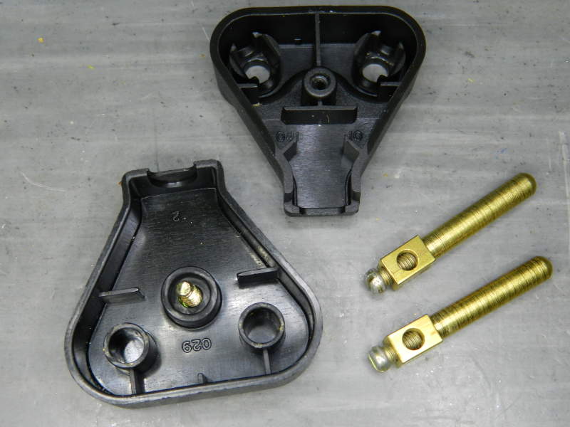 Então, a solução foi pegar um plugue de pinos maciços (figuras 4 e 5), adaptar nele dois fios rígidos de cobre, de bitola 2,5mm, dobrados de maneira a aceitar a maioria dos capacitores existentes, e deixá-lo encaixado no instrumento.