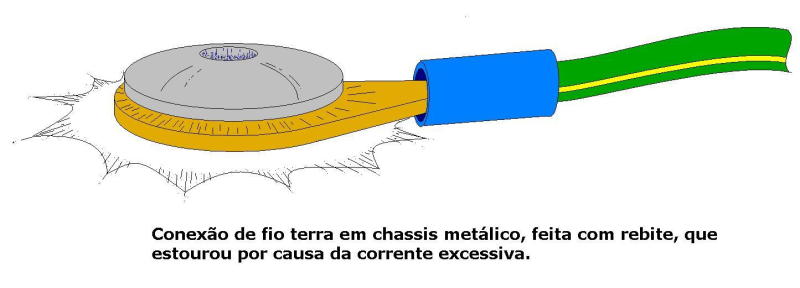Outro erro foi a ligação do fio terra à carcaça. Fizeram com um simples rebite. Infelizmente, não tirei a foto daquele local. Na figura 13 tem um desenho, onde tento mostrar como ficou a aparência da conexão de terra. A corrente elevada estourou a conexão e deixou o rebite folgado.