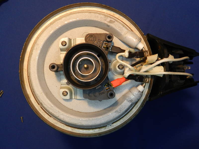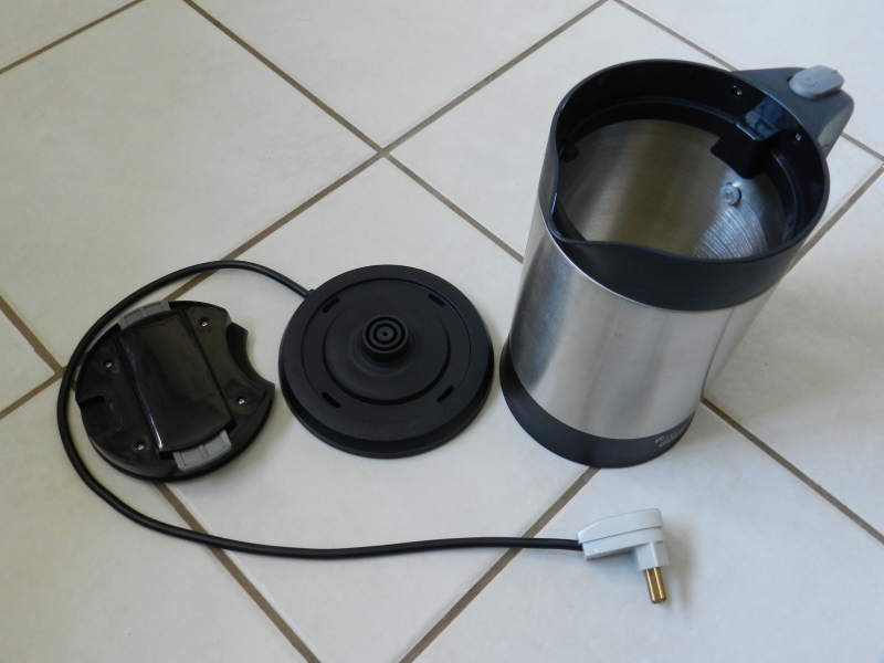 Este aparelho vem em duas partes, além da tampa (figura 2). A base (figura 3), é ligada à rede elétrica e fornece energia para a jarra, através de uma tomada central. Os pólos da rede elétrica ficam escondidos nesta tomada e tem molas que os empurram para cima (figura 4). O furo central é do fio terra.