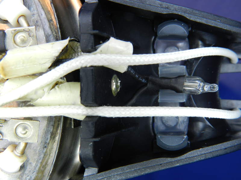 Na figura 8, podemos notar que a fiação de alta temperatura (fio branco, de capa trançada), não alcança um separador plástico à direita. Antes do separador, tem uma conexão deste fio branco com o fio preto, coberta com espaguete termo-retrátil. Os dois fios pretos vão para a lâmpada neon, que apenas indica que o aparelho está ligado.