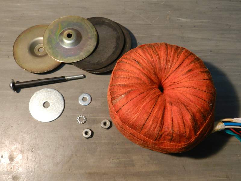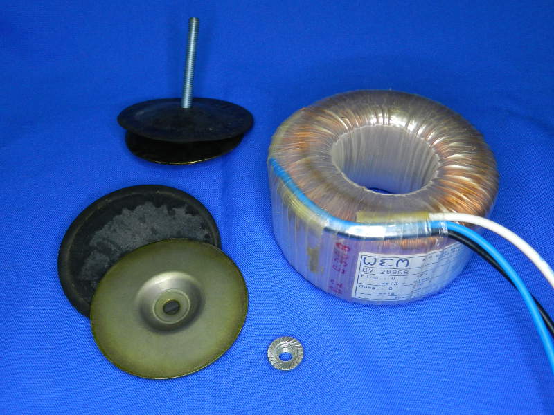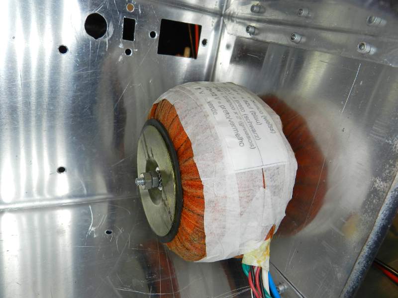 Observação: o parafuso central de fixação do transformador toroidal jamais poderá tocar a carcaça nas duas extremidades. Aquele disco de metal estampado, que se coloca na parte de cima do transformador toroidal, junto com outro disco, de borracha, é o apoio necessário para a fixação por um parafuso somente. Do lado de baixo também é colocado um disco de borracha (e eventualmente outro disco metálico), para proteger os fios de cobre do amassamento.