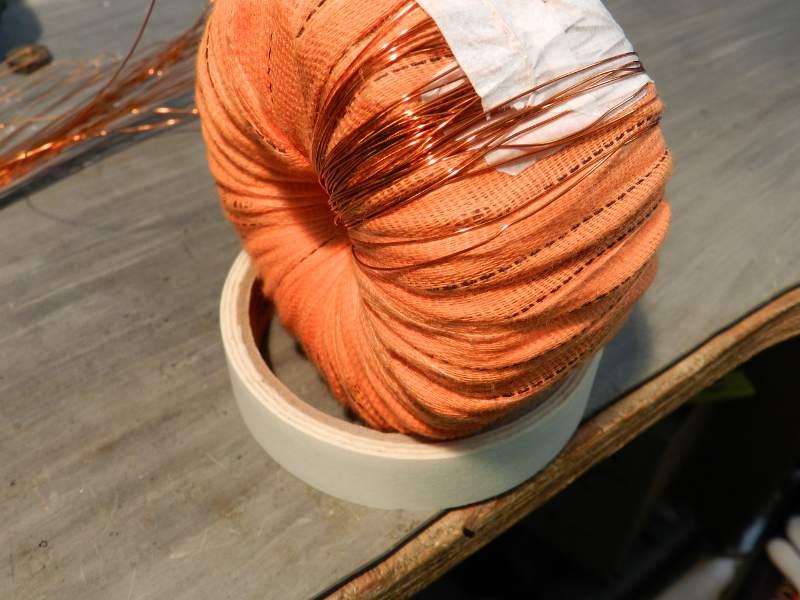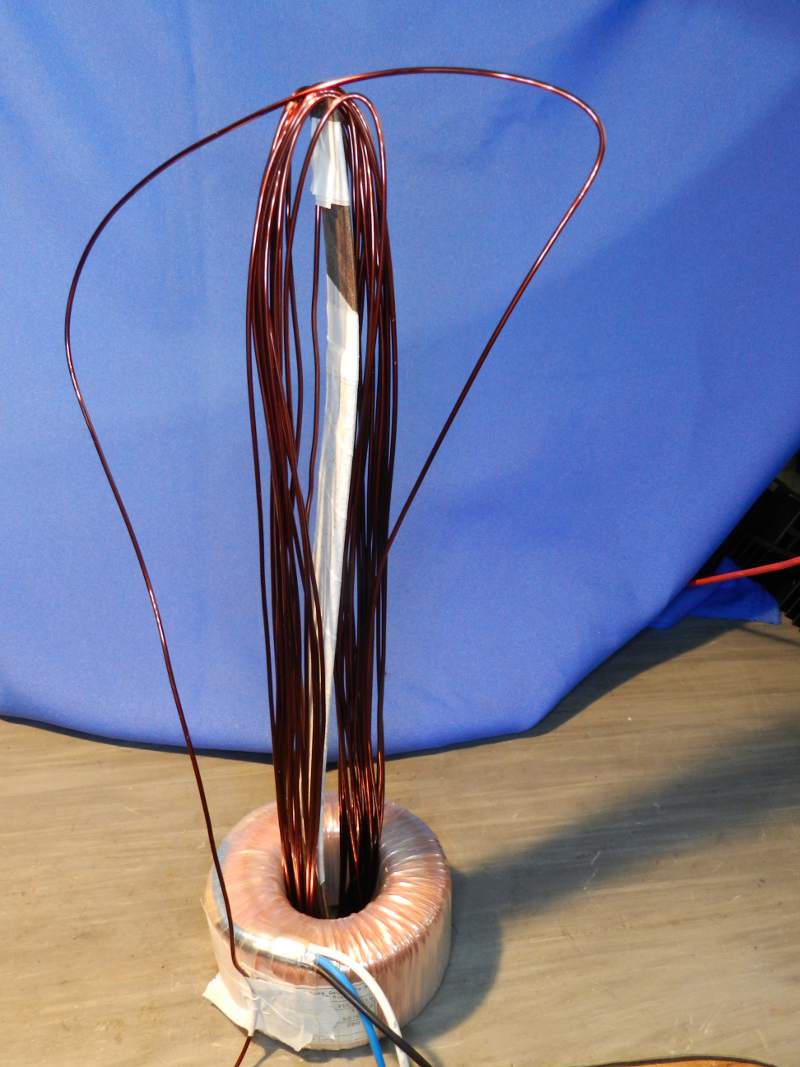 Como era preciso enrolar somente o secundário, este transformador serviu de cobaia para identificar as dificuldades e os resultados ao trabalhar com núcleos toroidais, já que tenho (e ainda quero utilizar) outros transformadores toroidais queimados, um pouco maiores, de amplificadores. Comprar uma máquina de enrolar transformadores, nem pensar…