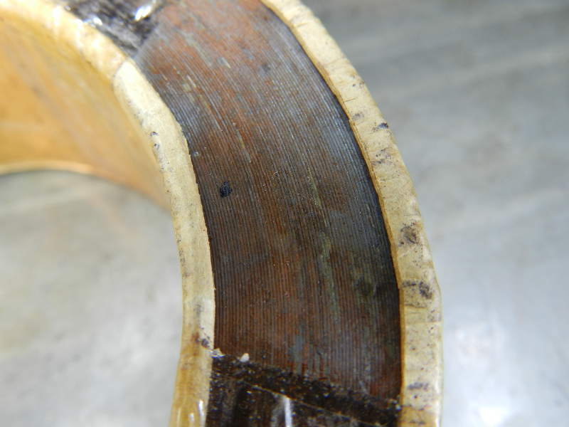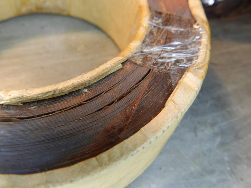 Para ter uma ideia do esforço a que o fio é submetido num transformador toroidal tradicional, a figura 9 mostra a compressão numa espira (ver a seta), bem como as fortes dobras que a fiação faz sobre as arestas do núcleo. Clicando nesta imagem, ela pode ser ampliada para melhor visualização (da mesma forma que em todas as outras).