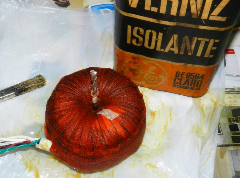 Por causa do diâmetro interno pequeno e por já existir um isolamento, que não foi retirado, a adição de 3 novos enrolamentos foi um pouco trabalhosa. No final, somente sobrou espaço para o parafuso central, e olhe lá…