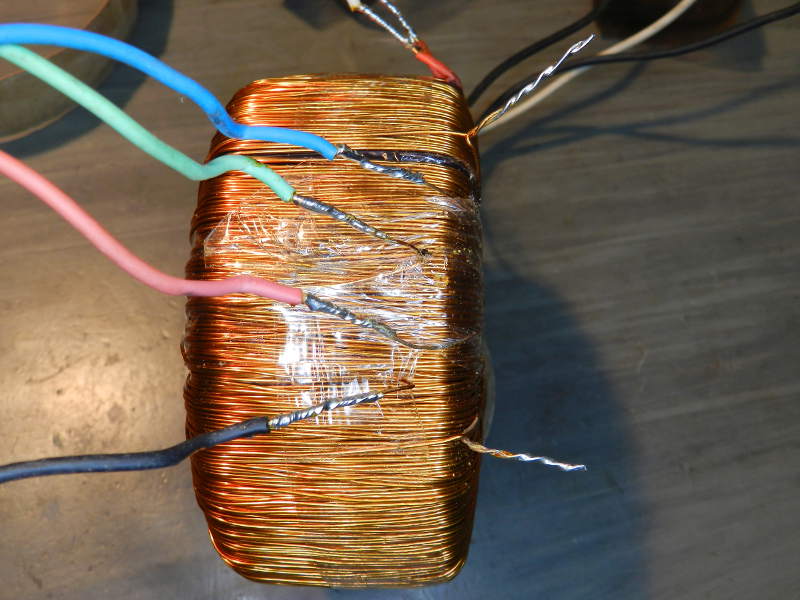 O autotransformador toroidal foi, então, convertido em um transformador abaixador (e isolador), com a adição destes 3 enrolamentos secundários. O enrolamento que existia, de 120 e 220VCA, agora é o primário (figura 13). A potência total do componente original era de 280VA, um valor bastante elevado para o pequeno tamanho do núcleo (100mm de diâmetro e 55mm de altura).
