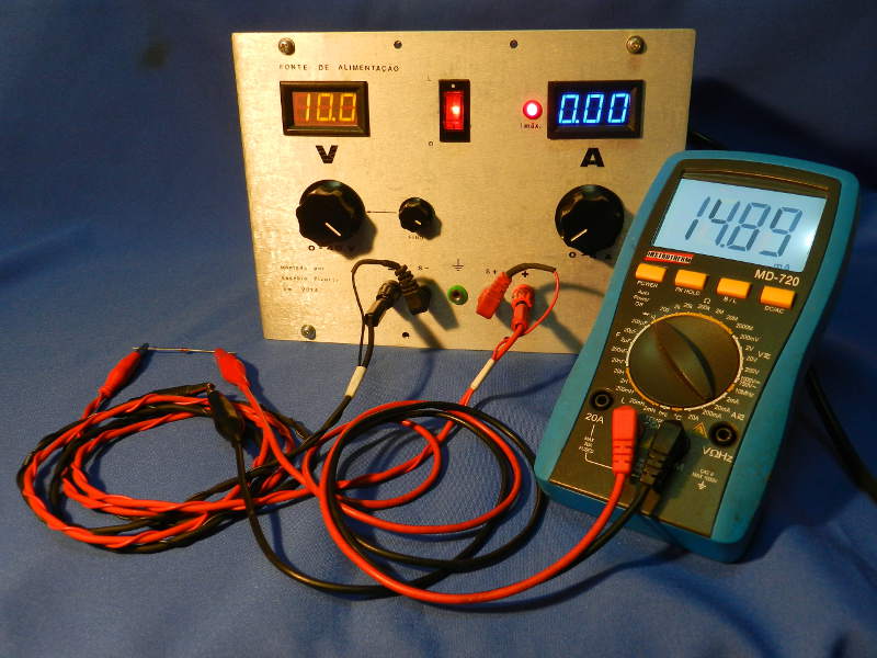 Para aferição, foi montado um circuito de teste, com a ligação em série de dois multímetros e um resistor de fio de 15 ohm, 5W, na saída da fonte. Os multímetros foram ajustados como amperímetros, na escala adequada. Com a ligação, a corrente que passa pelos 3 amperímetros e a carga (o resistor) é a mesma. É uma forma de minimizar os erros nas medições. A tensão de saída da fonte foi ajustada conforme a corrente desejada de teste.