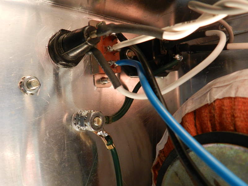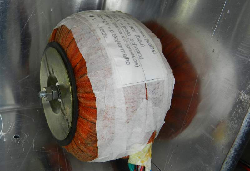 Nota: Já comentei no texto que por características intrínsecas do amperímetro, foi necessário adicionar um enrolamento CA exclusivo para este instrumento. Para isto, foi agregado um pequeno transformador ao gabinete, já que não cabia mais nada no transformador toroidal.