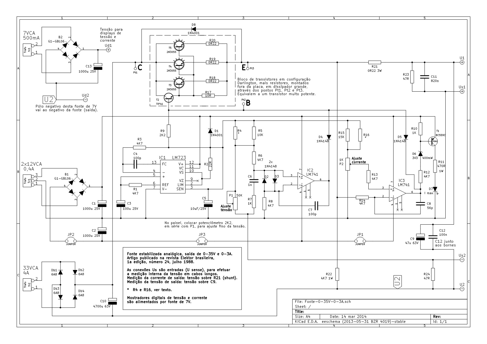 Não irei explicar o que aquele texto fez muito bem, sobre o funcionamento da fonte e suas características peculiares. Basta dizer que utiliza o tradicional LM723, auxiliado por dois comparadores LM741 e necessita de transformador(es) com enrolamentos independentes, um para a alimentação dos integrados e outro para a saída da fonte.