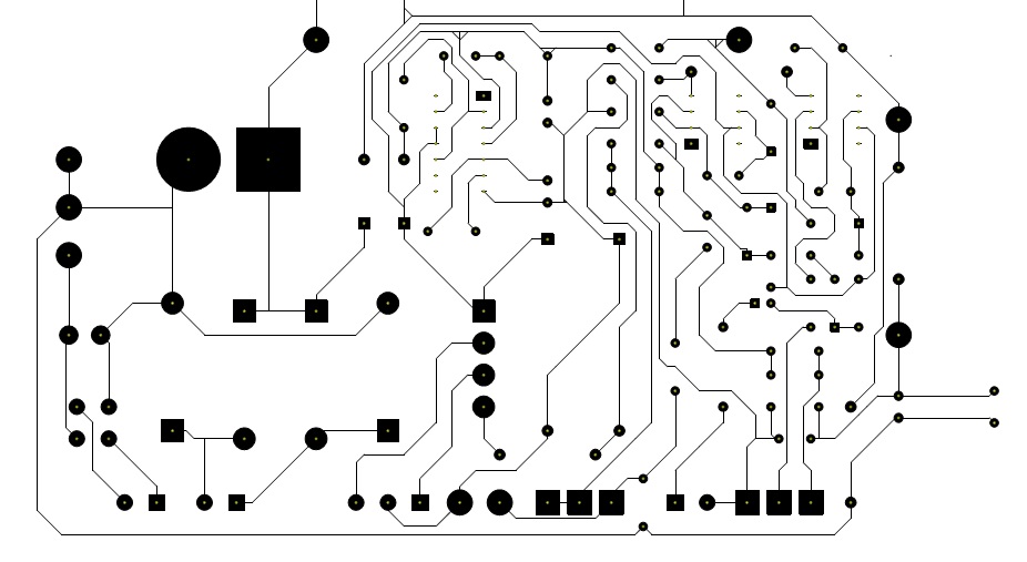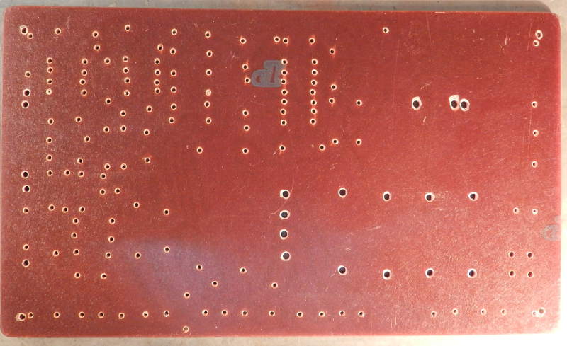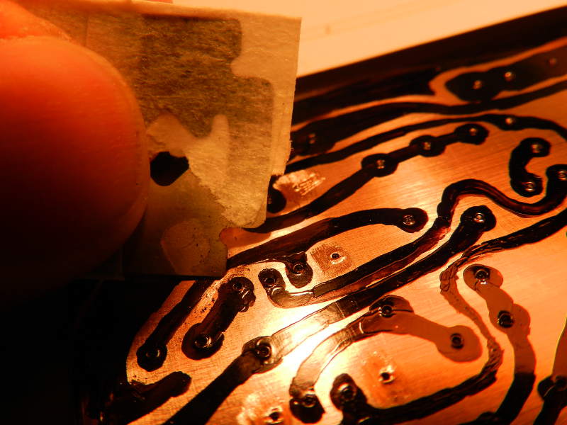 O método é simples. Para começar, coloco a placa cortada no tamanho final, sem rebarbas, limpa com palha de aço (o lado cobreado) e fixada pelas bordas à mesa, com o cobre virado para cima. Alinho a ela a folha impressa com o lado cobreado (impressão espelhada do KiCad) e começo a marcar levemente os furos, com um fino punção de aço. Após, retiro o papel e faço as trilhas com a caneta para retroprojetor (ou para CD), sempre cuidando o desenho impresso. Os retoques finais são feitos com uma lâmina de barbear, para remover qualquer curto-circuito. Eventualmente é necessário refazer alguma trilha.