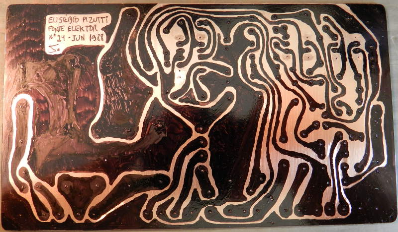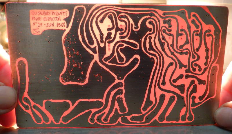 Para apressar a corrosão, costumo deixar exposta a menor quantidade possível de cobre, para ser removido no banho de percloreto de ferro (ou cloreto férrico, é a mesma coisa). Isto também aumenta a durabilidade do líquido corrosivo. A economia de tempo é necessária para evitar que a camada de tinta da caneta comece a levantar. Não é interessante apressar a corrosão com o aquecimento da solução, pois os desenhos feitos a caneta das trilhas, soltarão mais rápido ainda…