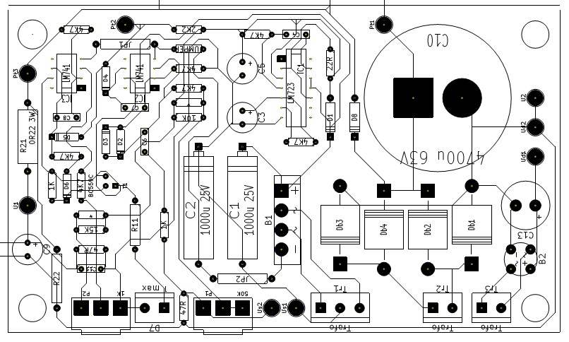 O projeto original da placa não era bem o que eu queria, pois utilizava capacitores axiais, que são difíceis de encontrar. Por isto, redesenhei parte do circuito impresso e fiz pequenas alterações, como a inclusão de fonte para os mostradores e a separação do estágio de potência. Além disso, como a placa foi adaptada para mostradores digitais, foram excluídos R25, R26, P3 e P4. Se o leitor pretender utilizar os indicadores analógicos de corrente e tensão, melhor será montar a placa do artigo original da Elektor.