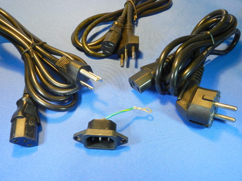 Figura 19 – Plugues intercambiáveis, de 3 padrões diferentes e mesma conexão de saída. A tomada C14 do centro da foto é a que vem montada nos aparelhos, e atende à norma IEC60320.
