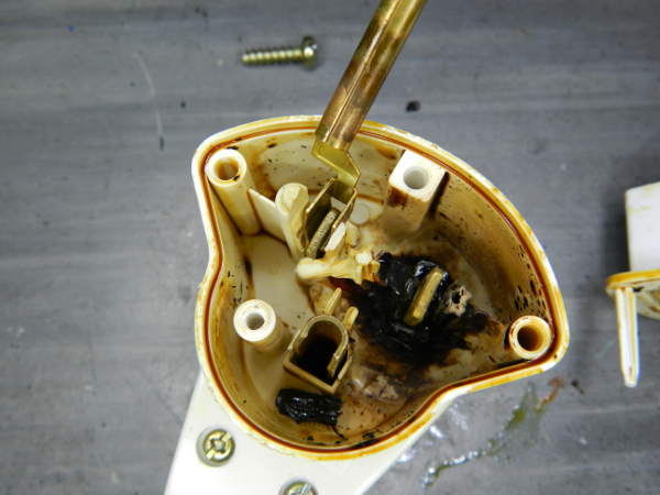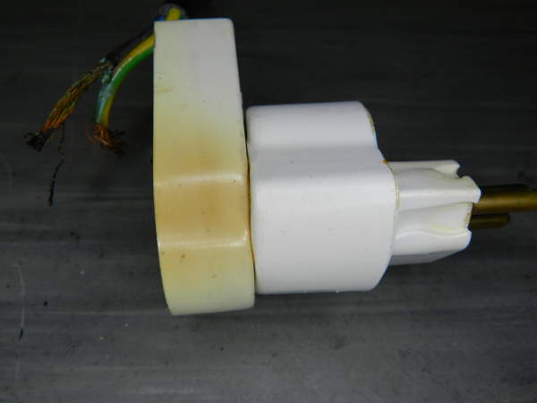 Não houve incêndio porque a junção aqueceu tanto que deslocou a posição dos pinos, o que acabou interrompendo a ligação. Mas dá para ter uma ideia do problema, olhando o interior do plugue e do adaptador. As duas peças ficaram tão soldadas, que foi preciso quebrar o plugue para poder verificar o que tinha acontecido (ver a sequência de desmontagem, figuras 2 a 13).