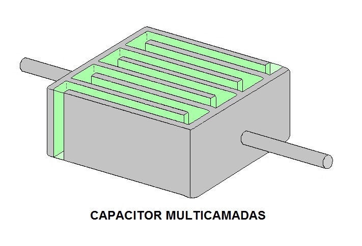 Para uso em altas frequências, o tipo multicamadas é o mais adequado, porque apresenta menores indutâncias parasitas. Capacitores cerâmicos, de mica, SMD e certos modelos de filmes plásticos são montados desta maneira.