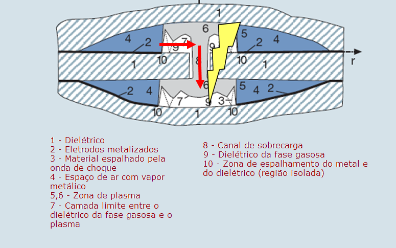 No canal de sobrecarga, as altas temperaturas atingidas (até 6000ºK), transformam o dielétrico em plasma altamente comprimido, o que força sua expansão (formando a bolha). O finíssimo revestimento de metal nas imediações do canal de sobrecarga é totalmente evaporado pela interação com o plasma, em direção esférica, para longe da descarga. A rápida expansão do plasma causa seu resfriamento (gás em expansão resfria) após alguns microssegundos, extinguindo a descarga antes de ocorrer uma perda de tensão apreciável. A região isolada resultante da descarga possibilita que o capacitor continue a ser utilizado normalmente.