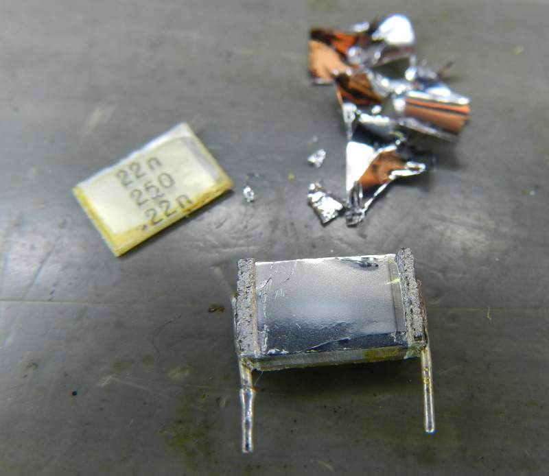 Figura 7 – Capacitor multicamadas de 22nF parcialmente desmontado.
