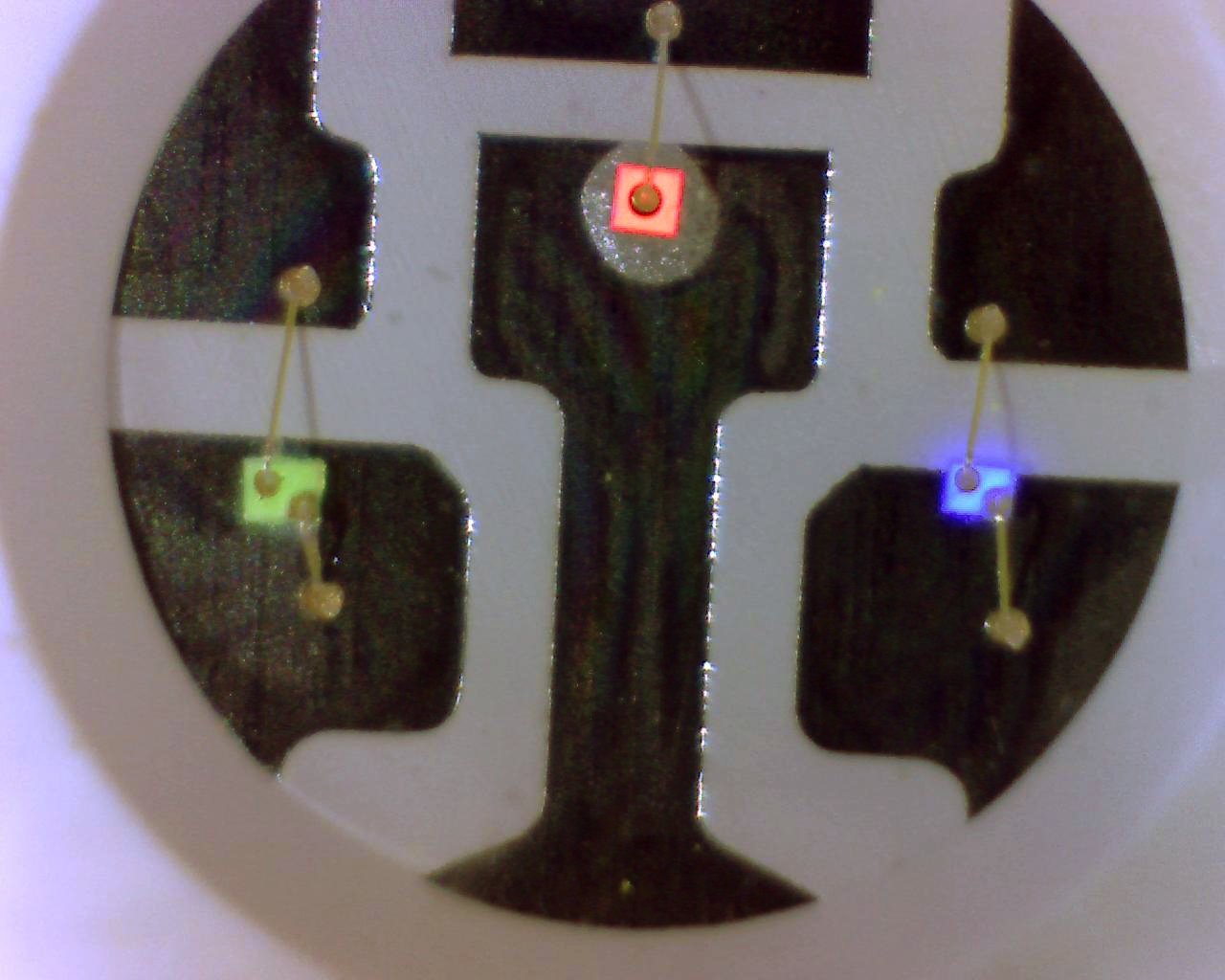 Figura 18 – LED RGB Everlight, de montagem em superfície (SMD), onde podem ser vistos os 3 chips soldados ao invólucro (dois do tipo LLED e um VLED (vermelho, que é o mais escuro deles)). Fonte: Wikimedia Commons [44].