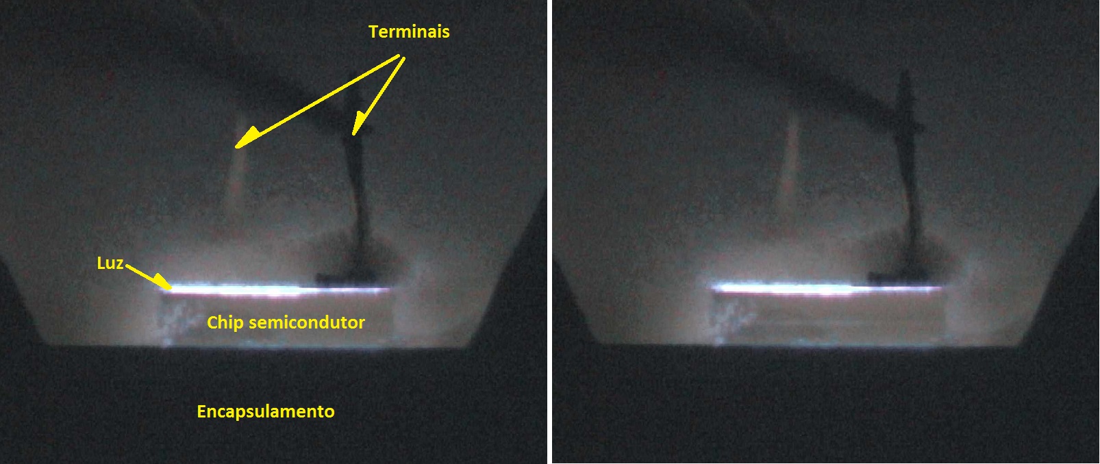 Na figura 20, temos uma imagem de microscópio eletrônico, mostrando um LED de perfil, emitindo luz. A região ativa é somente aquela linha iluminada, onde os fótons são gerados.