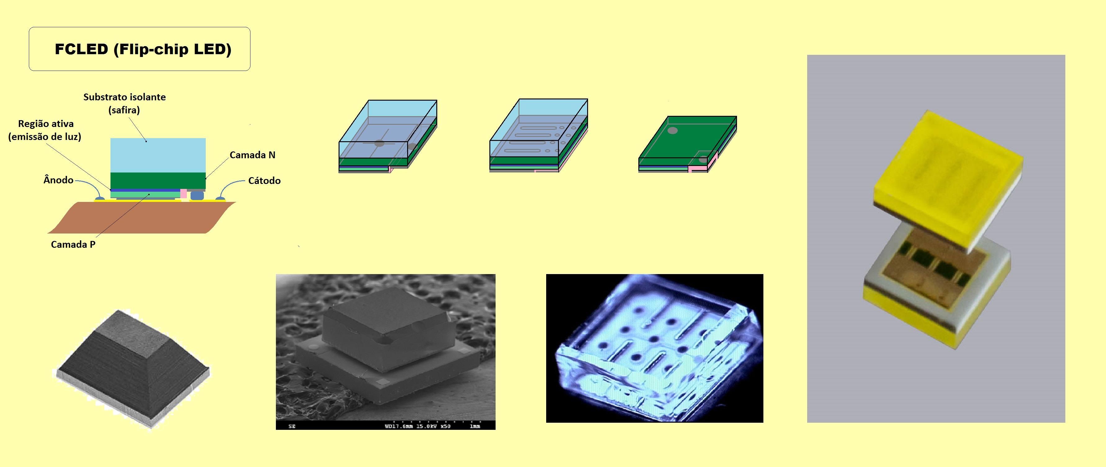Figura 21 – Modelos de pastilhas (chips) de arquitetura FCLED, com algumas diferenças evolutivas e exemplos reais.