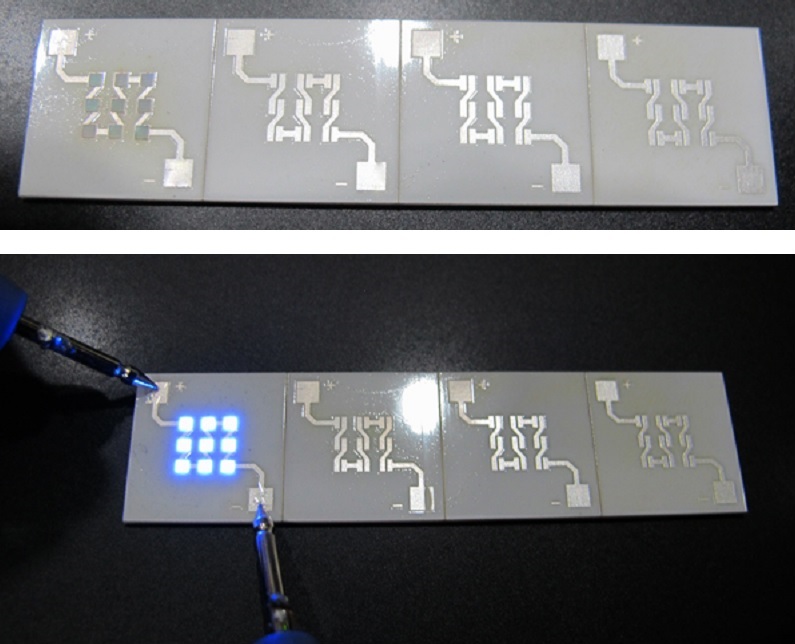 Há também finas películas condutoras, semitransparentes, conectadas aos respectivos terminais (pads), que formam os eletrodos (cátodo e ânodo) e que possibilitam as ligações externas com o semicondutor.