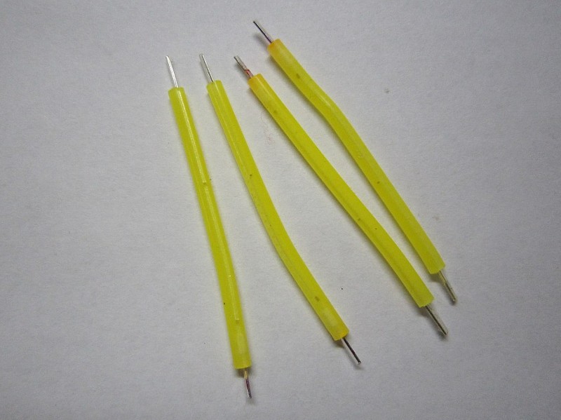 Dependendo do fabricante, o fósforo poderá ser depositado no filamento LED como uma resina (figuras 7 e 8) ou como um espaguete (figura 9). Este modelo de espaguete, em especial, parece ter a base dos LEDs feita em metal, pois o filamento é flexível (figura 10). Inclusive, existem no mercado lâmpadas de filamento LED com filamentos curvados (figura 11).