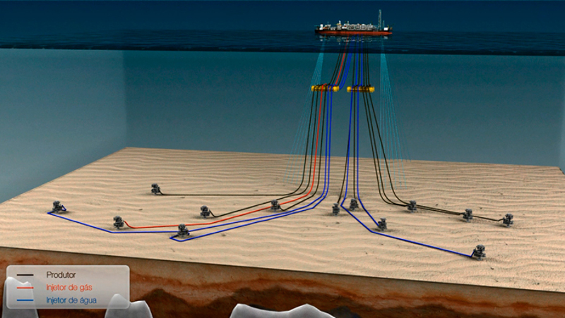 Figura 8 – Plataforma de extração do Pré-Sal com navio-plataforma (FPSO), com dois risers concentradores de cabos. Fonte: Jornal GGN [7].