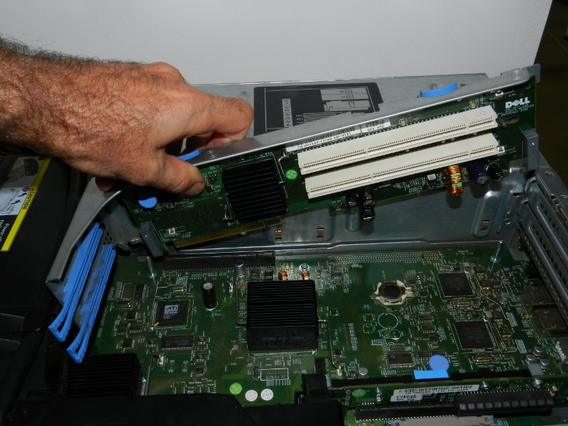 Os equipamentos da DELL tem um foco na facilitação da manutenção, ainda mais no caso deste servidor, que é bastante caro e projetado para trabalhar em regime de 24×7 (24 horas por dia, 7 dias por semana). Não há parafusos para remover a placa riser, só encaixes.