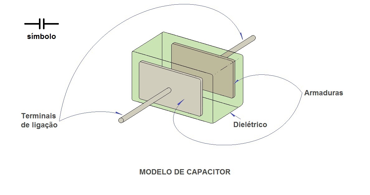 O capacitor é um componente que armazena cargas elétricas, devido ao efeito de atração entre as cargas positivas e negativas. É formado por duas armaduras metálicas (placas ou eletrodos), isoladas entre si (figura 26). Sua capacidade de armazenamento (capacitância) é medida em Farads e aumenta com a área das placas ou com a aproximação delas.