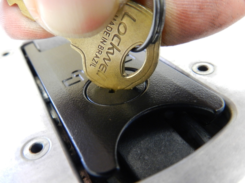 A retirada da tampa é a única que precisa de alguma ferramenta, que pode ser uma pequena moeda ou chave. A fechadura única, após destravada, libera a tampa, deslizando-a um pouco para trás (figuras 5 a 7).