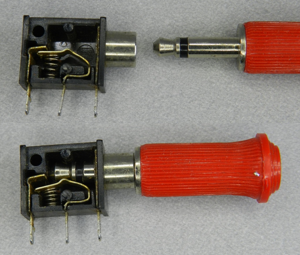 Para conseguir isso, emprega-se uma tomada (jack) de 3,5mm mono, de 3 terminais, com chave interna. A figura 10 mostra um jack deste tipo, junto a um plugue mono.