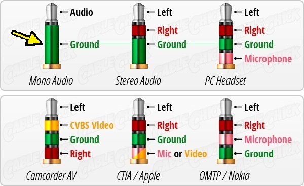 Figura 15 – Conexões elétricas para a maioria dos plugues de 3,5mm. A utilizada nesta adaptação foi marcada com a seta. Fonte: Quora [17].