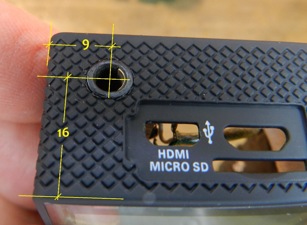 Nessa câmera, a localização do furo, que deve servir para a maioria dos jacks, fica a 9mm da face inferior e 16mm da face posterior, como está marcado na figura 16. No meu caso, fiz 1mm mais para baixo (ficou a 8mm da base), o que impediu de instalar um jack rosqueado (rever figura 12). Outra opção seria um jack miniatura como aquele da figura 14, mas deve-se garantir que ele tenha a chave interna e que fique bem apoiado.