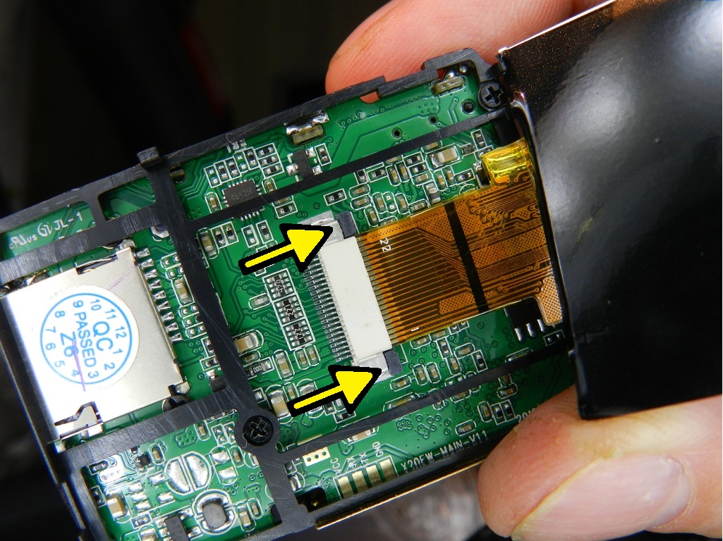 A remoção do display requer algum cuidado, pois ele fica colado ao conector do cabo flat com fita dupla face, deve-se colocar o cartão entre o mostrador e o conector e forçar suave e lentamente, até soltar. Para remover o cabo flat do display, o conector tem abas que devem ser deslizadas no sentido das setas da figura 2. A figura 3 mostra o cabo destravado e solto.