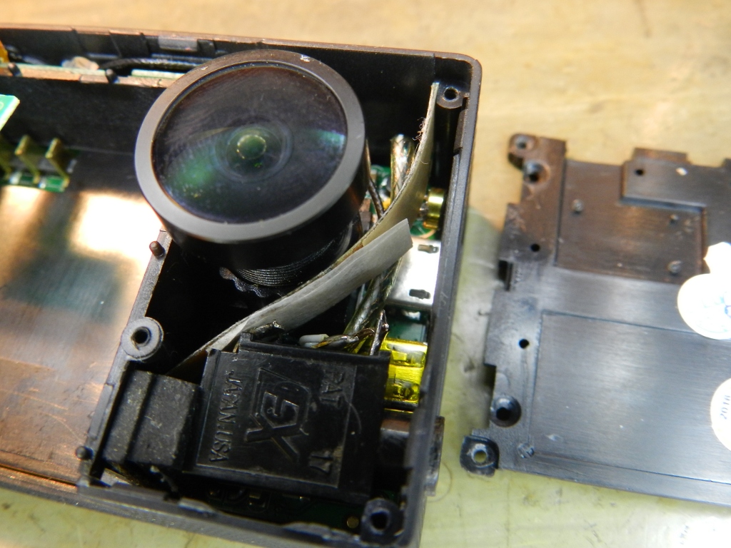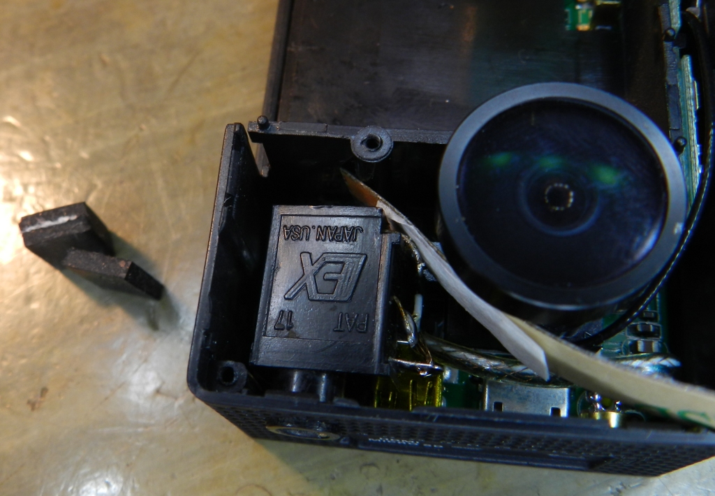 A única dificuldade foi recolocar a antena do WiFi (aquela fita entre a lente e a tomada, que aparece na figura 25). Ela era colada bem no canto onde foi montado o jack e teve que ser reposicionada. Para evitar algum contato elétrico indevido, a antena foi isolada com fita crepe, exatamente no local onde faz pressão sobre a tomada do microfone.