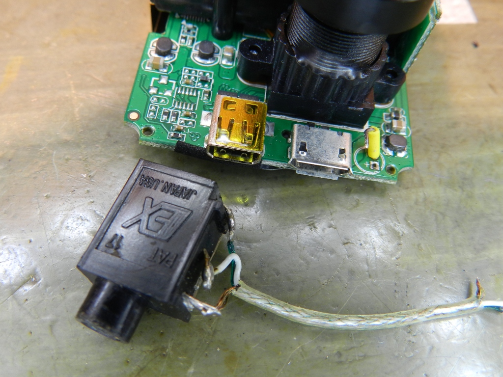 Utilizei uma tomada de 3,5mm japonesa, pois aqui a procedência é muito importante, para evitar falhas de funcionamento. O furo de 6mm na câmera ficou bem justo, mas isto veio a calhar, pois ajuda na fixação, já que esta tomada não tem rosca.