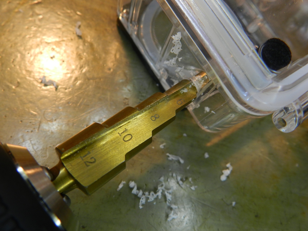 Para não errar a localização, foram abertos furos cada vez maiores, até o diâmetro de 10mm. Para facilitar o serviço, inicialmente foram utilizadas brocas de 1mm, 2,5mm e 3,5mm. Depois, com uma broca múltipla chegamos ao diâmetro de 10mm (figuras 34 a 36).